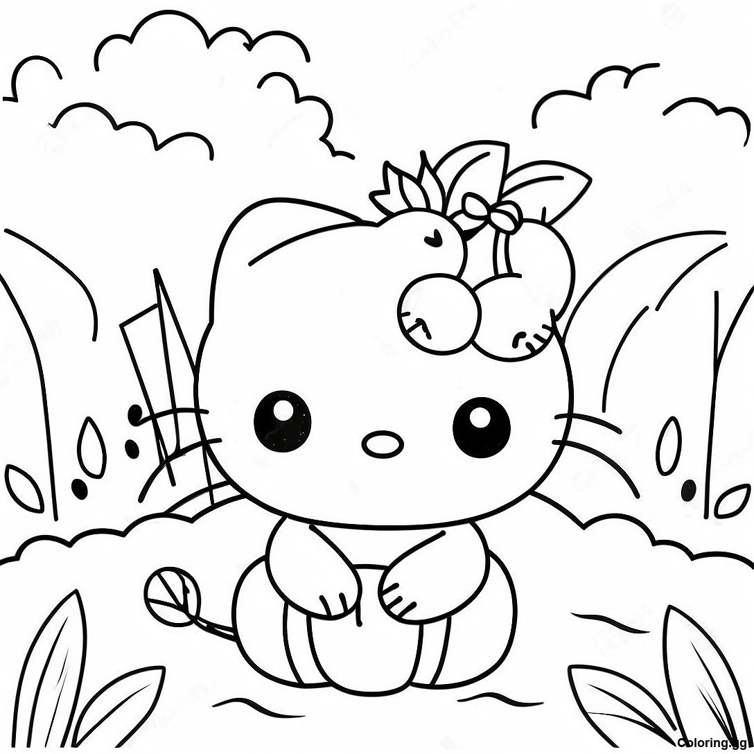 Χέλο Κίτι σε Κήπο με Λουλούδια Σελίδα Ζωγραφικής