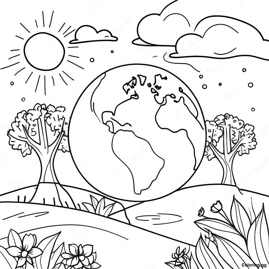Σελίδα Ζωγραφικής Με Όμορφη Γη Με Δέντρα Και Λουλούδια